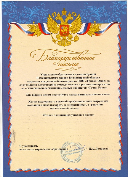 Выражаем искреннюю признательность за плодотворную совместную деятельность в рамках федерального проекта «Точка роста». Хотим подчеркнуть высокий уровень профессионализма Вашего персонала и поблагодарить за оперативность в решении вопросов. Желаем компании процветания и дальнейших успехов в реализации новых проектов.