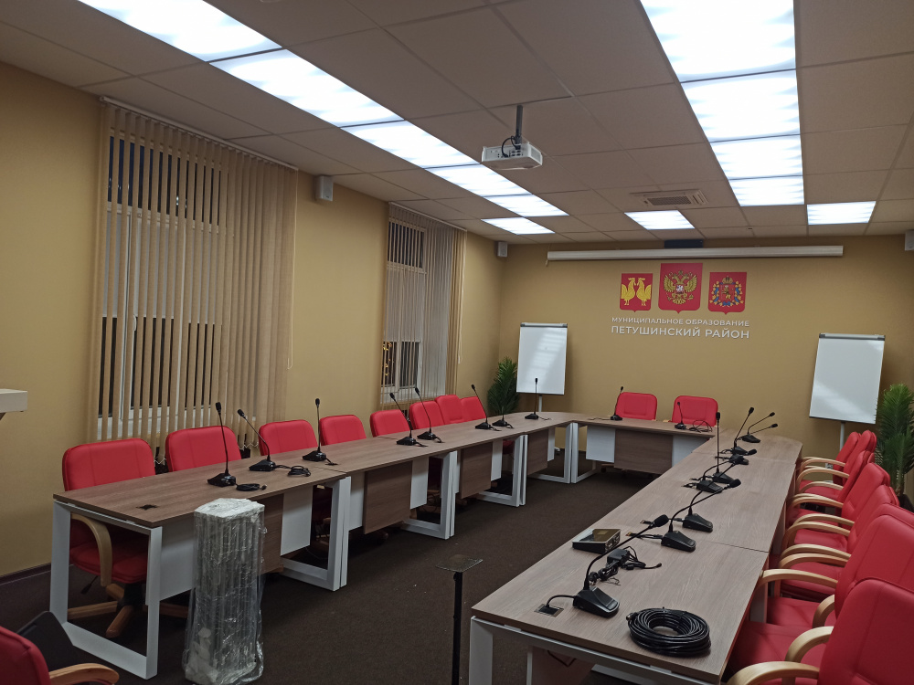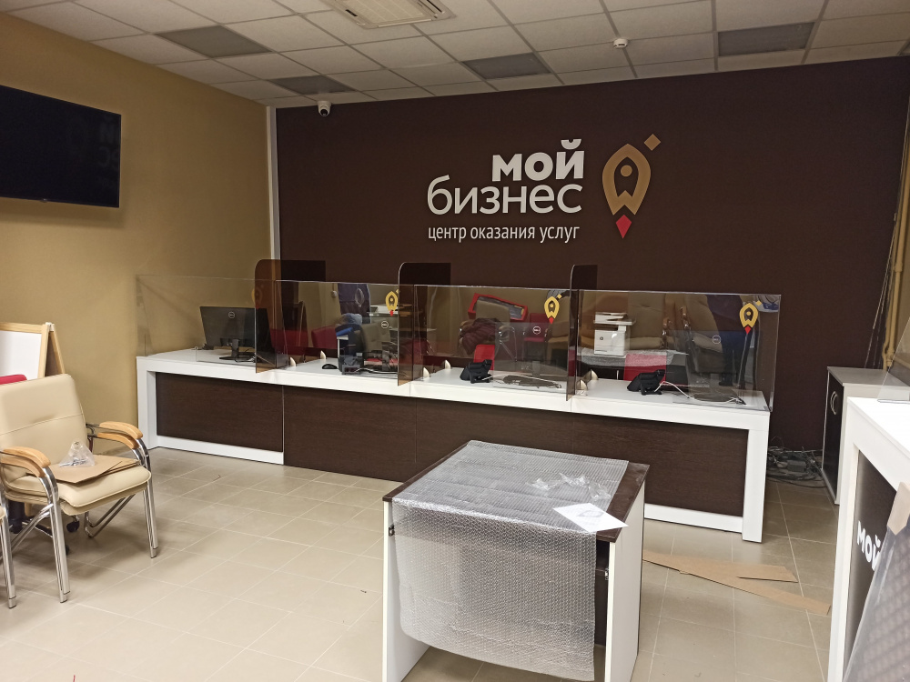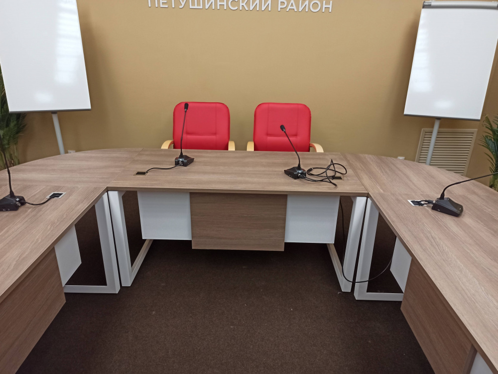 Задача: Изготовление мебели по брендбуку. Комплектация переговорного зала. Модифицированные рабочие места, кресла, перегородки, мягкие модули