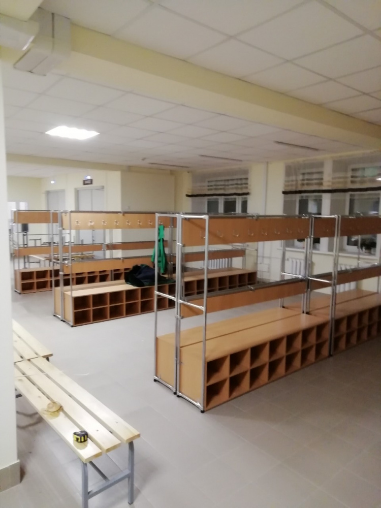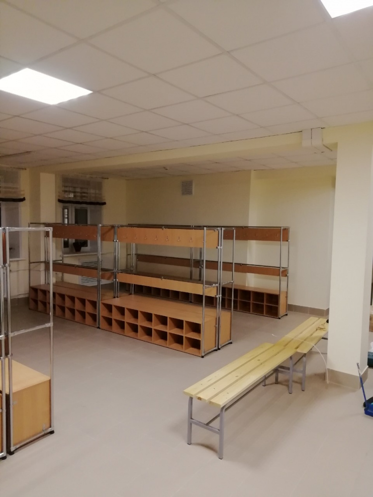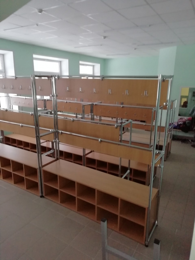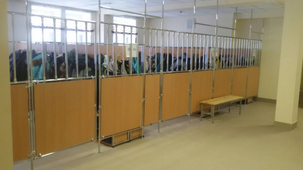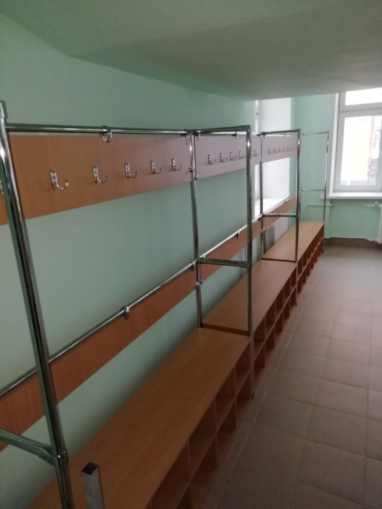 Решение: Мебель для общего гардероба была индивидуально спроектирована, с учетом размеров помещения и особенностей при монтаже. Количество мест 800. Так же была спроектирована и поставлена мебель для начальной школы на 350 мест. Данные секции предусматривают отделение для сменной обуви и крючки для верхней одежды. Мебель для столовой - это специальные столы, имеющие крепления под столешницами для табуретов. Данная функция позволяет оперативно провести уборку помещения.