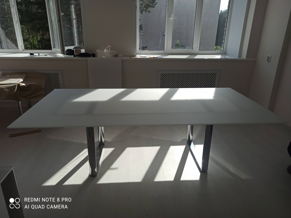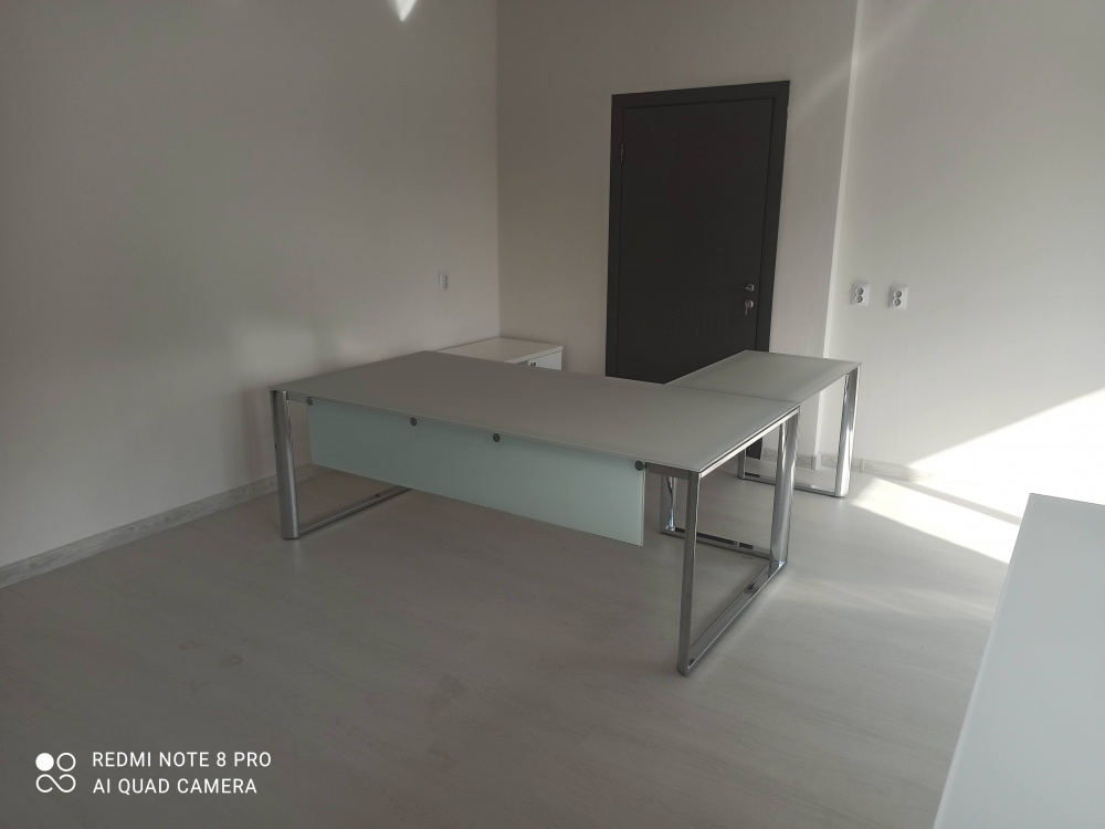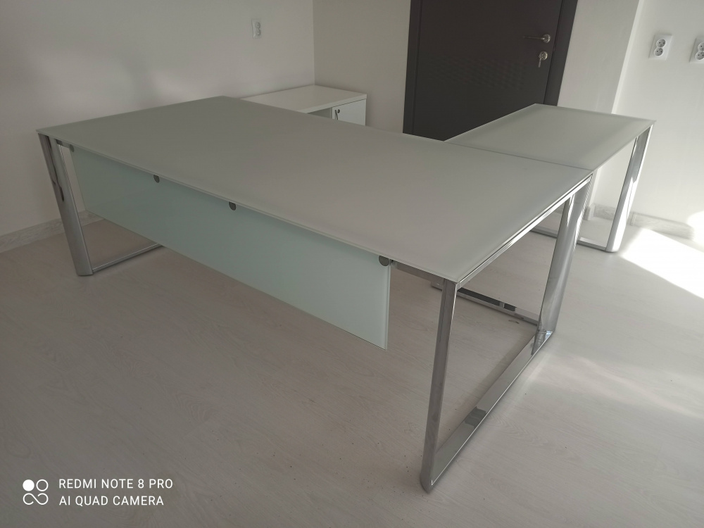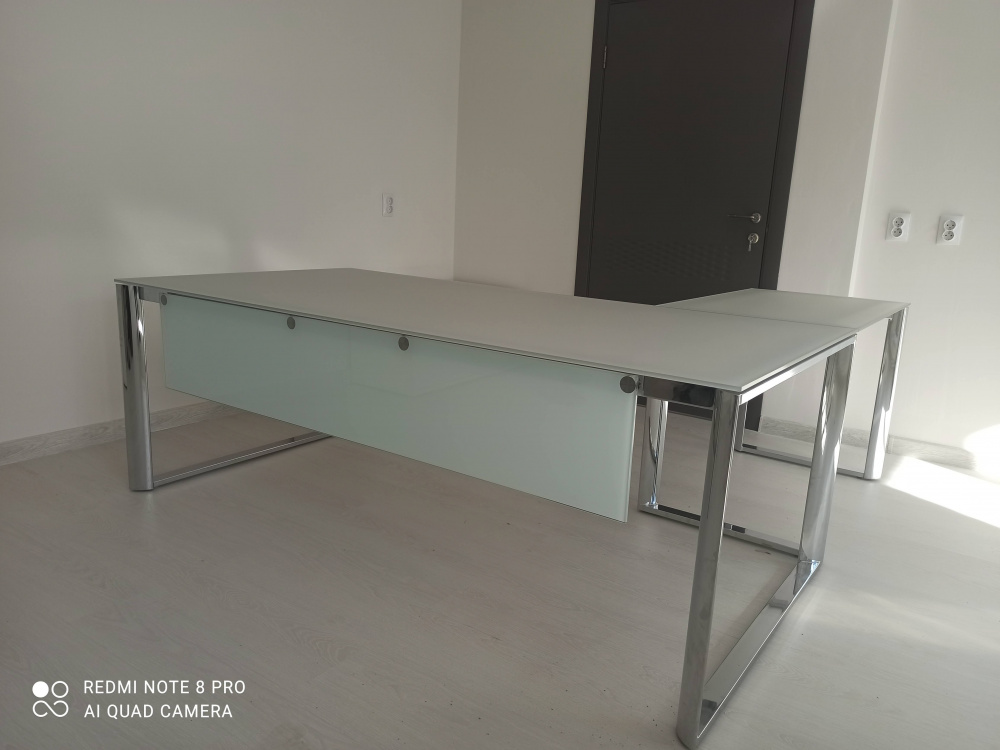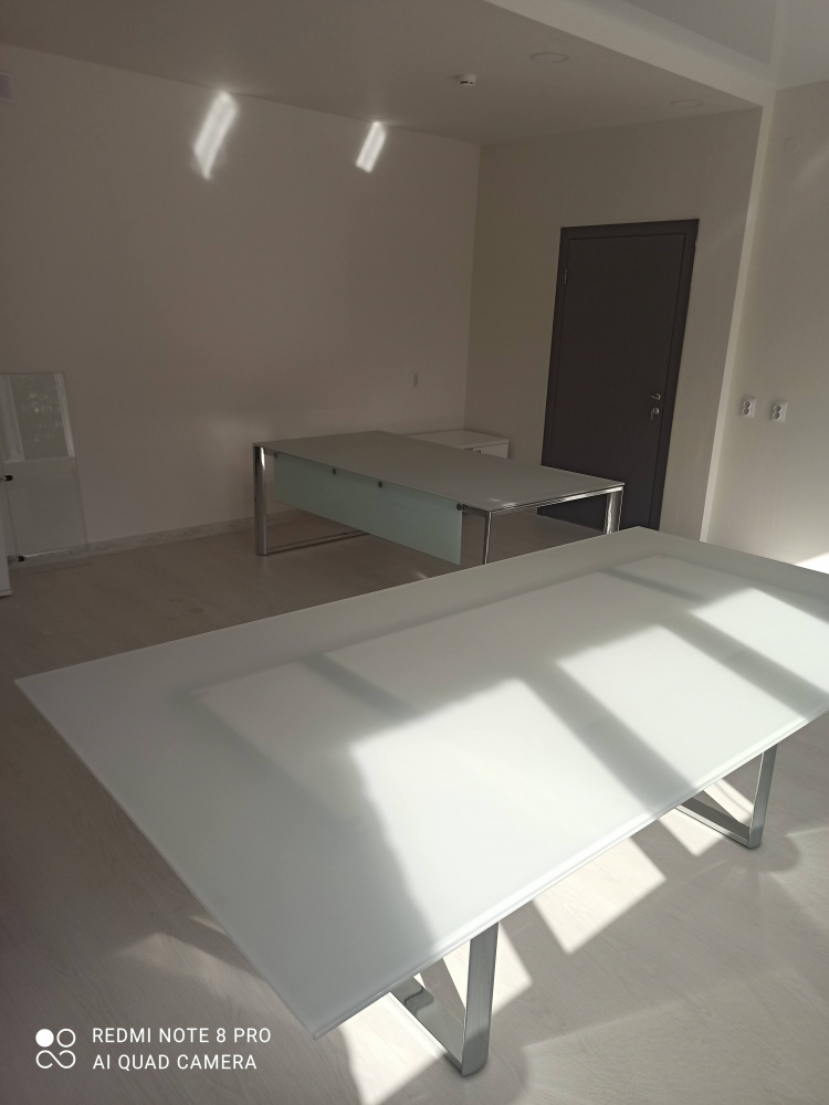 Решение: Поставка мебели с учетом технических характеристик , прописанных в тех.задании. Особенностью является стеклянные закаленные, безопасные столешницы столов и стеклянная царга стола.