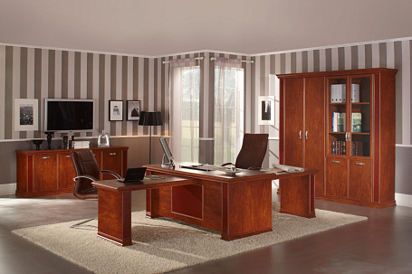 Классический кабинет руководителя Porto - мебель, которая радует своего владельца каждый день. Эта модель разработана итальянским дизайнером Marco Bortolin (Марко Бортолин). Что такое кабинет руководителя классический? Мебель с фигурными бордюрами, карнизами и цоколями, а в Porto еще есть декоративные вставки под кожу с крокодиловым тиснением. Эти детали подчёркивает статус уверенного в себе, респектабельного и надежного владельца. Кабинет PORTO представлен в изысканных цветах - светлом дубе, тёмном Rover cafe и благородном орехе классик. Стол руководителя можно дополнить брифингом, боковой приставкой, одной или двумя подвесными тумбами. Большая греденция может использоваться как с панелью, где вы можете поместить ТВ, а на стеклянные полки поставить любимые предметы декора, так и без панели, в качестве низкого шкафа. Кабинет одинаково хорошо смотрится как в офисе, так и в качестве домашнего кабинета, украшая интерьер частного дома или коттеджа.